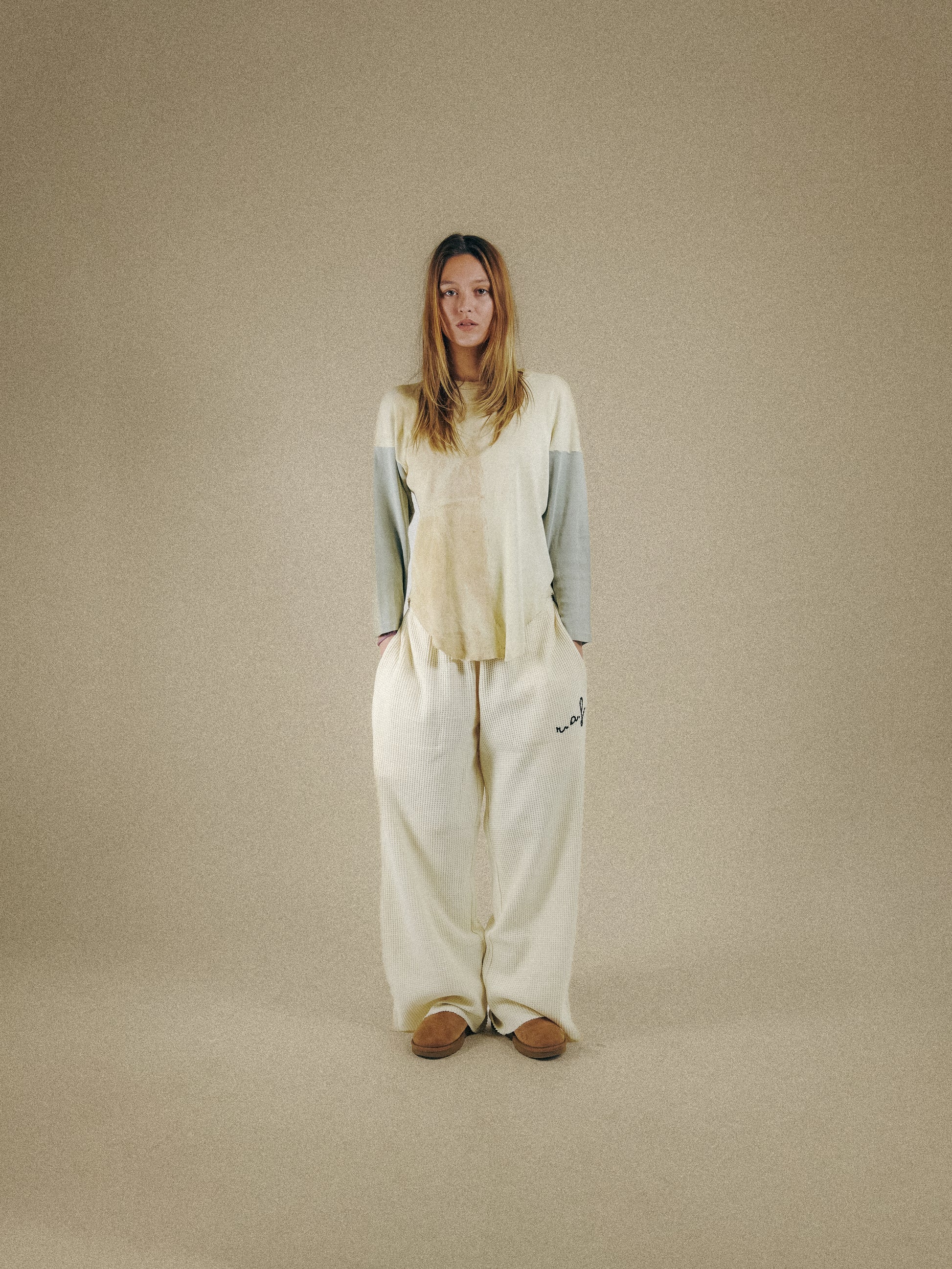 Made from 100% cotton waffle-knit thermal, the fabric features a structured yet breathable feel with a textured pattern that adds depth to each silhouette. Its natural softness and durability make it ideal for both full-length and modular cut “long short” designs.